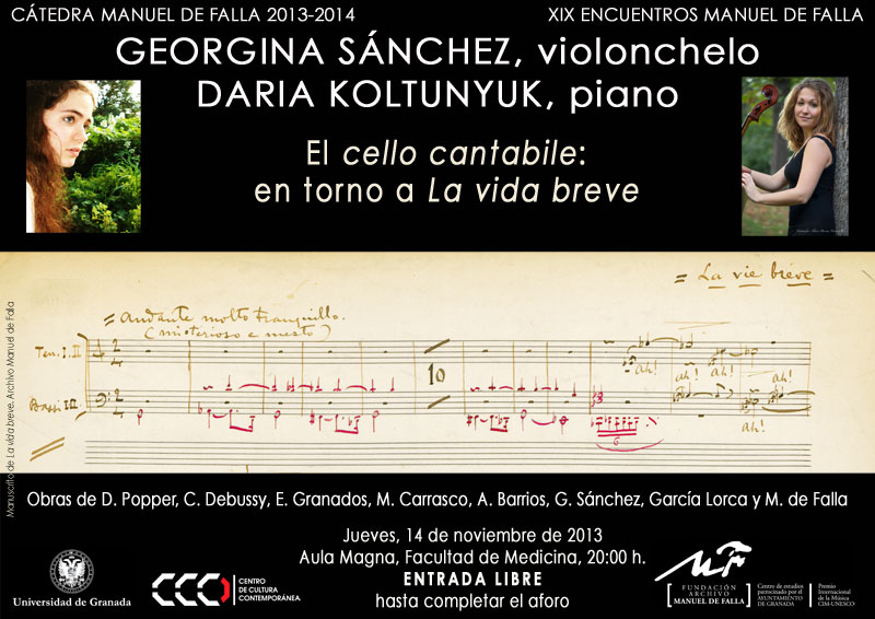 CÁTEDRA MANUEL DE FALLA - DOSSIER DE PRENSA XIX Ciclo de Música de Cámara Georgina Sánchez Torres, violonchelo Daria Koltunyuk, piano “EL CELLO CANTABILE: EN TORNO A LA VIDA BREVE” En el marco de los XIX Encuentros Manuel de Falla Organizan: Cátedra Manuel de Falla / Centro de Cultura Contemporánea / Vicerrectorado de Extensión Universitaria y Deporte / Universidad de Granada / Fundación Archivo Manuel de Falla / Centro de Estudios patrocinado por el Ayuntamiento de Granada Fecha: Jueves, 14 de noviembre de 2013 Lugar: Aula Magna Facultad de Medicina Hora: 20,00 h. ENTRADA LIBRE hasta completar el aforo Dossier de prensa Cartel