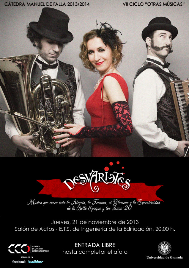CÁTEDRA MANUEL DE FALLA - DOSSIER DE PRENSA VII CICLO “OTRAS MÚSICAS” DESVARIETES ORQUESTINA Organiza: Cátedra Manuel de Falla Centro de Cultura Contemporánea Vicerrectorado de Extensión Universitaria y Deporte Universidad de Granada Fecha: Jueves, 21 de noviembre de 2013 Lugar: Salón de Actos E. T. S. Ingeniería de la Edificación Hora: 20:00 h. ENTRADA LIBRE (LIMITADA AL AFORO DEL RECINTO) Dossier Cartel